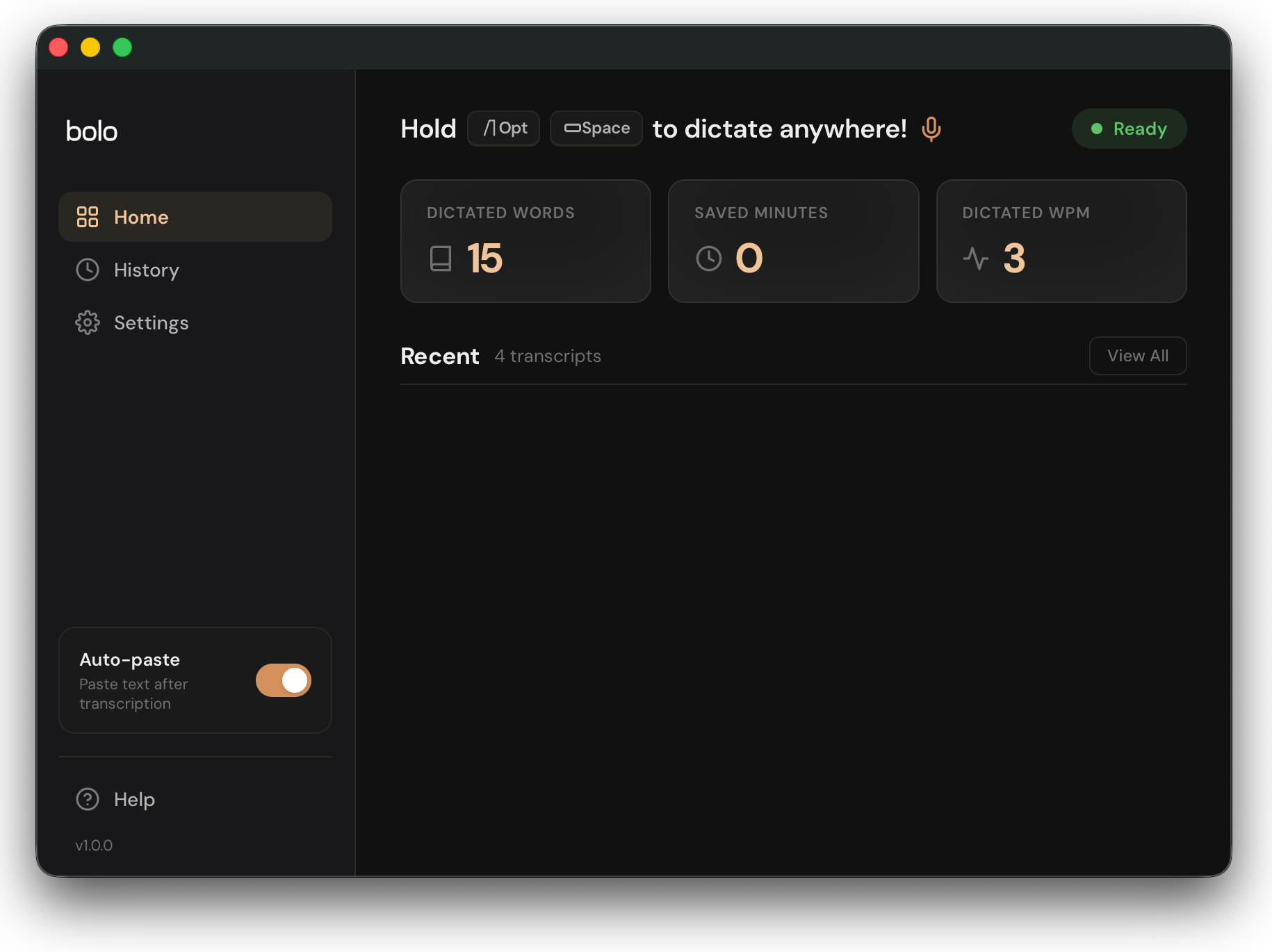 Hold Option+Space to dictate. Bolo transcribes locally, formats your text, and auto-pastes anywhere. No switching apps, no clicking buttons.